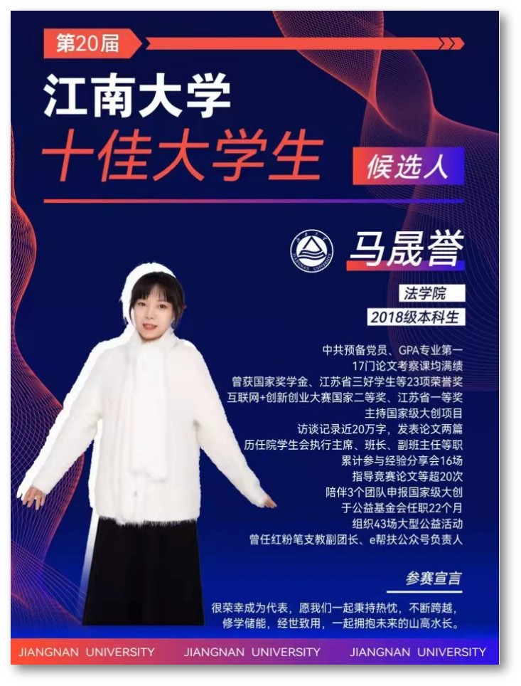 决赛现场,马晟誉从她用了八年的“樱子为爱出征”微信名开始风采展示,“为爱出征”的信念缘起于她2011年走了两小时山路去探望一个困境儿童的故事。多年扶贫助学公益路上,孩子们一声声“要像你一样优秀”一直是她很重要的前进动力。从专业第九到保持第一,43门课程满绩,获国奖、省三好等23项荣誉奖励,省级及以上奖项5项,和困境儿童一起见证成长,彼此成为奋进的榜样。