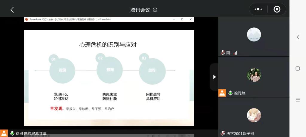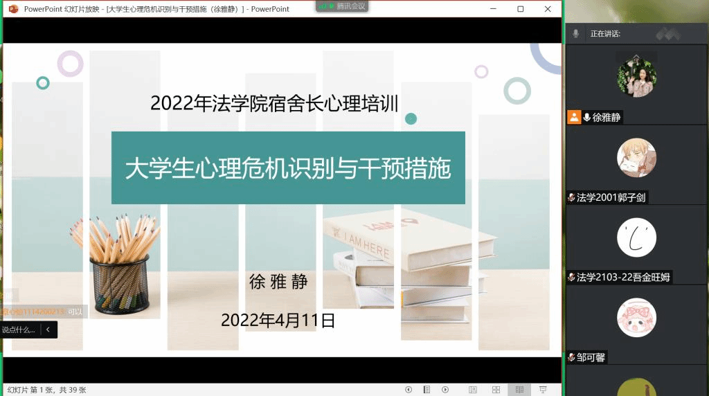 4月11日下午,yl7703永利官网在腾讯在线会议上开展2022年宿舍长心理专题培训会。由yl7703永利官网心理工作负责辅导员徐雅静老师进行主题为《大学生心理危机识别与干预措施》的心理培训,130余名宿舍长参会。