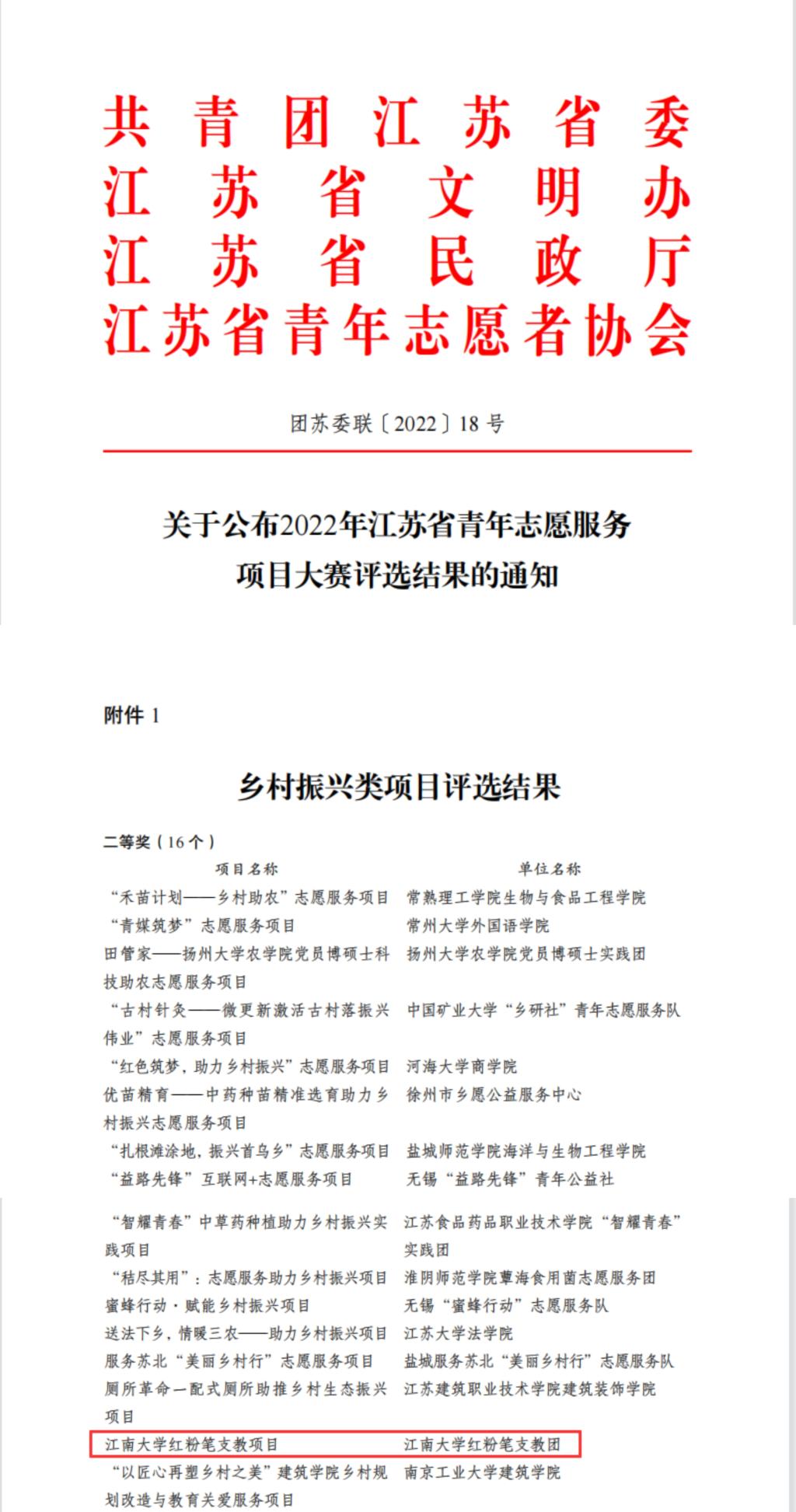 近日,由共青团江苏省委联合省文明办、省民政厅、省青年志愿者协会等单位共同开展的2022年江苏省青年志愿服务项目大赛暨第六届中国青年志愿服务项目大赛江苏省选拔赛结果揭晓,yl7703永利官网“红粉笔支教团”志愿服务项目获江苏省青年志愿服务项目大赛二等奖。