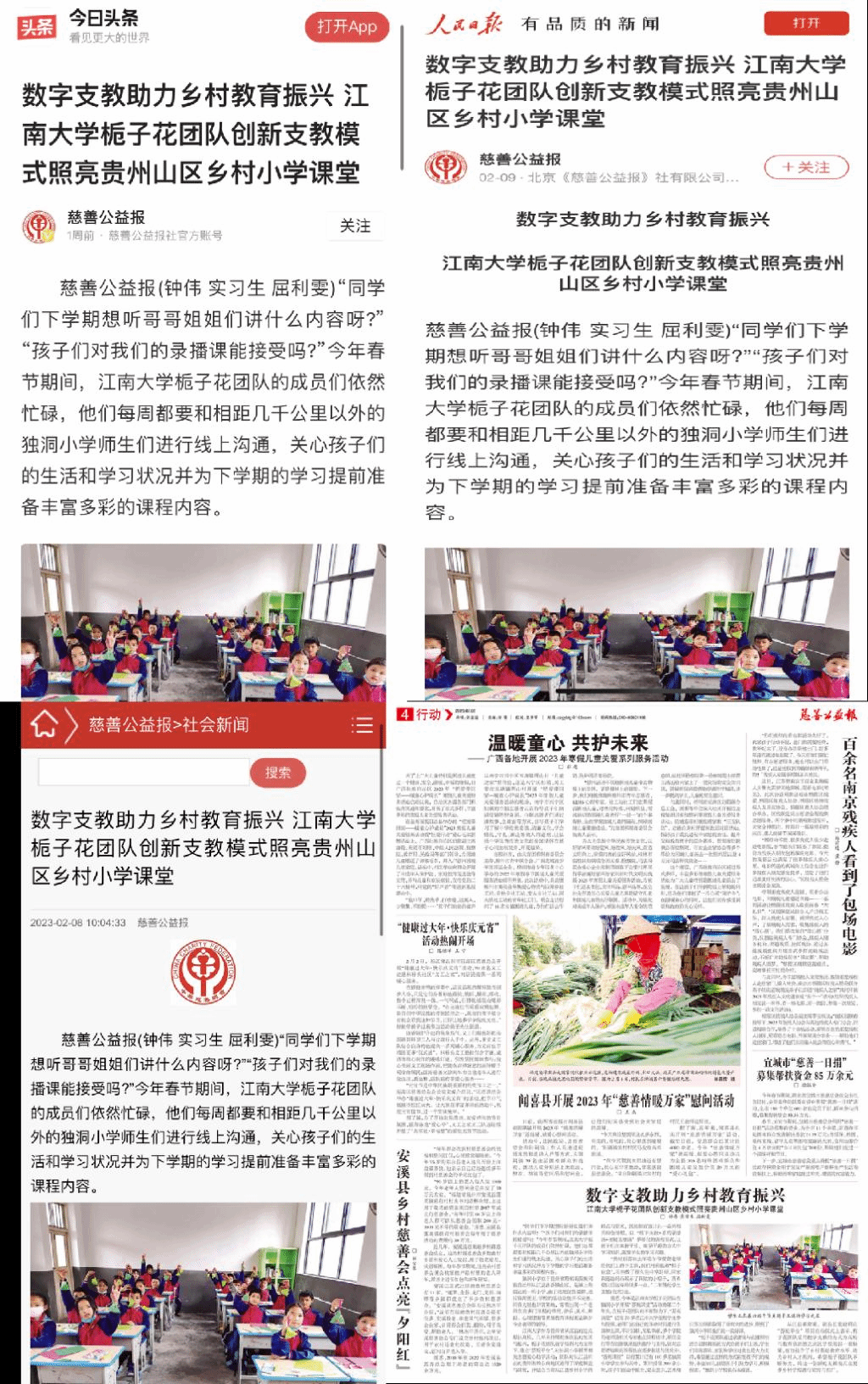 《慈善公益报》等多家媒体以《数字支教助力乡村教育振兴---yl7703永利官网栀子花团队用创新支教模式照亮贵州山区乡村小学课堂》为题,报道了我院栀子花团队采用数字支教方式助力乡村教育振兴的事迹,受到了广泛关注。