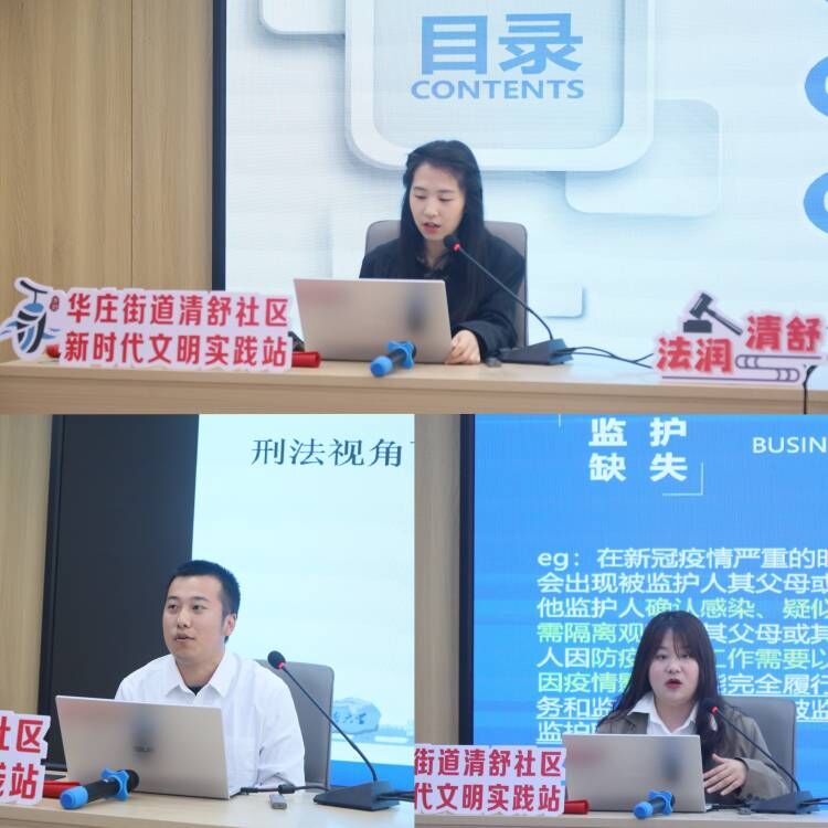 团队成员杨金茂基于刑法、物业管理条例相关法律规定,结合“电动车上楼充电造成安全事故”“乱堆乱放杂物造成火灾”等社区管理典型案件,讲述社区公共空间责任归属、社区工作人员对公共空间的管理义务、社区居民对公共空间使用的权利和义务,致害后果的责任分配等。团队成员刘静围绕社区监护专题进行宣讲,结合《中华人民共和国民法典》和相关案例,讲述社区监护程序的启动流程,以及社区履行监护义务的内容。团队成员方钰雯围绕侵权专题进行宣讲,讲述高空抛物侵权、饲养动物侵权、噪声污染侵权等相关法律问题,让居民详细了解高空抛物侵权的责任承担、以及饲养动物损害责任的一般规范、饲养动物在遗弃、逃逸期间致人损害责任承担等内容。
