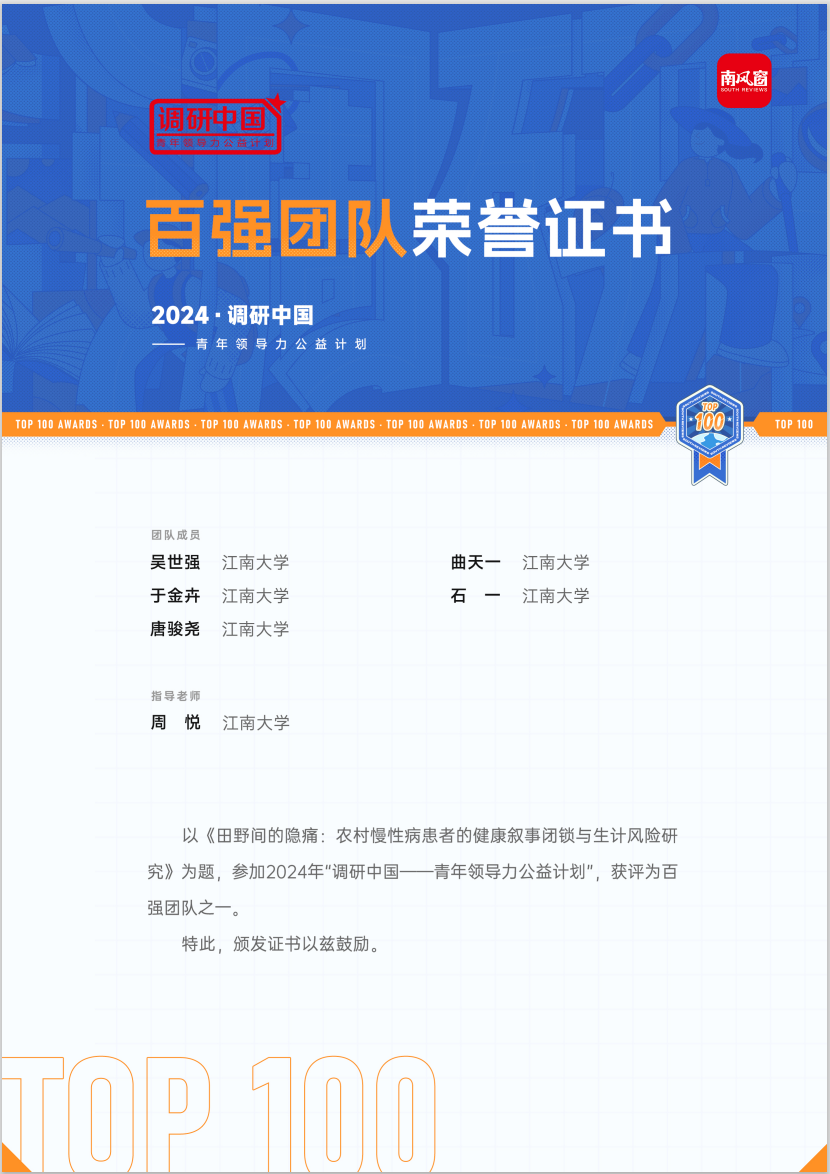 由我院红粉笔支教团成员申报的调研项目《田野间的隐痛:农村慢性病患者的健康叙事闭锁与生计风险研究》从252所高校的623支队伍的激烈角逐中脱颖而出成功入选「2024调研中国」百强队伍。队伍由yl7703永利官网不同学科的本科生组成,组长为22级社会工作本科生吴世强,成员有23级社会工作本科生于金卉、23级法学本科生唐骏尧、22级临床医学本科生石一、23级物联网本科生曲天一。指导老师为社会学系周悦博士。