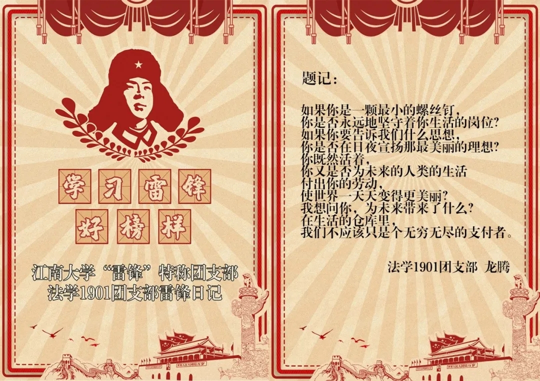 从2月开始,法学1901团支部完成各项准备工作,在线上完成了《雷锋日记》的学习,了解雷锋事迹及其生前所做的好人好事,并发动支部团员续写《雷锋日记》,让大家通过续写日记的方式,记录自己参与的志愿服务活动,表达自己对雷锋的敬意。据不完全统计,支部34名团员先后续写“雷锋日记”近100篇。2020年抗击新冠疫情期间,雷锋班累计有11名优秀青年加入各地的疫情防控志愿工作,用实际行动展现青年的责任、使命与担当,他们所续写的抗疫《雷锋日记》,让更多同学在日记中感受到青年学子的责任与担当。