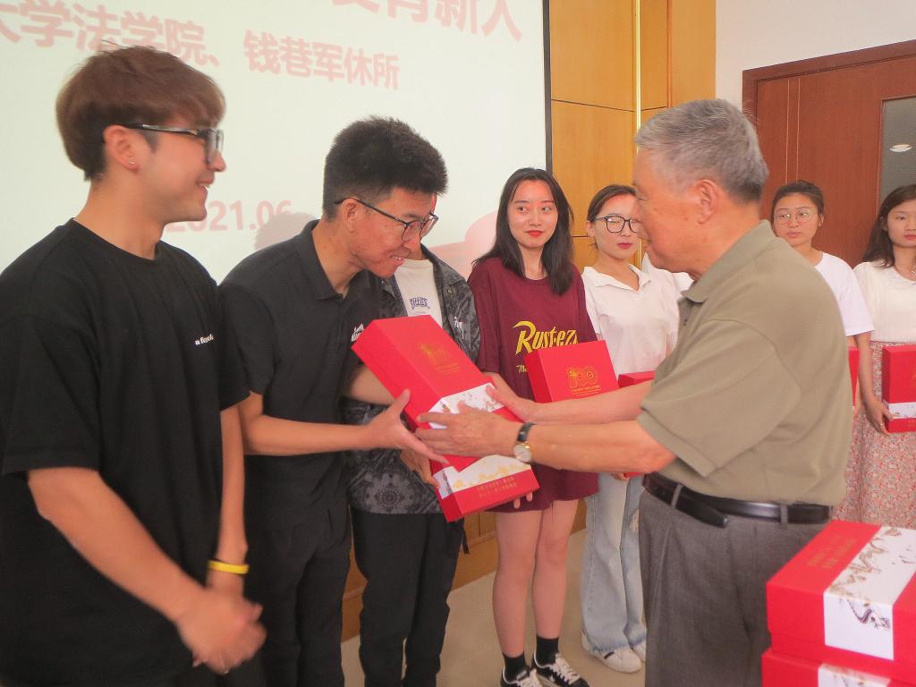 最后,由钱巷军休所退休干部王亚民教授给每一位少数民族学生赠送建党百年纪念品,并合影留念。