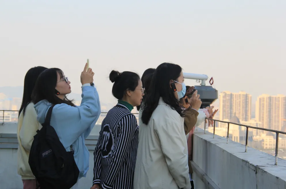 小黄车从峨嵋山路出发,带着同学们沿着运行路线游览校园秋景。一路上,董丽亚为同学们详细介绍了沿途特色建筑,包括三食堂、二教楼、百草园、黑天鹅栖息地等。随后,同学们到达了游园第一站——图书馆。在会务组员工热情的讲解与带领下,同学们参观了图书馆4楼的荣氏纪念馆和16楼接待室,站在学校最高点俯瞰整个校园。参与活动的同学们纷纷表示:“本次活动让我们印象深刻,在学校生活这么久却一直没有从最高处眺望过校园,也从未系统了解过各个建筑背后的故事,很高兴这个活动可以给大家提供多角度参观校园、了解校园历史文化的机会。”