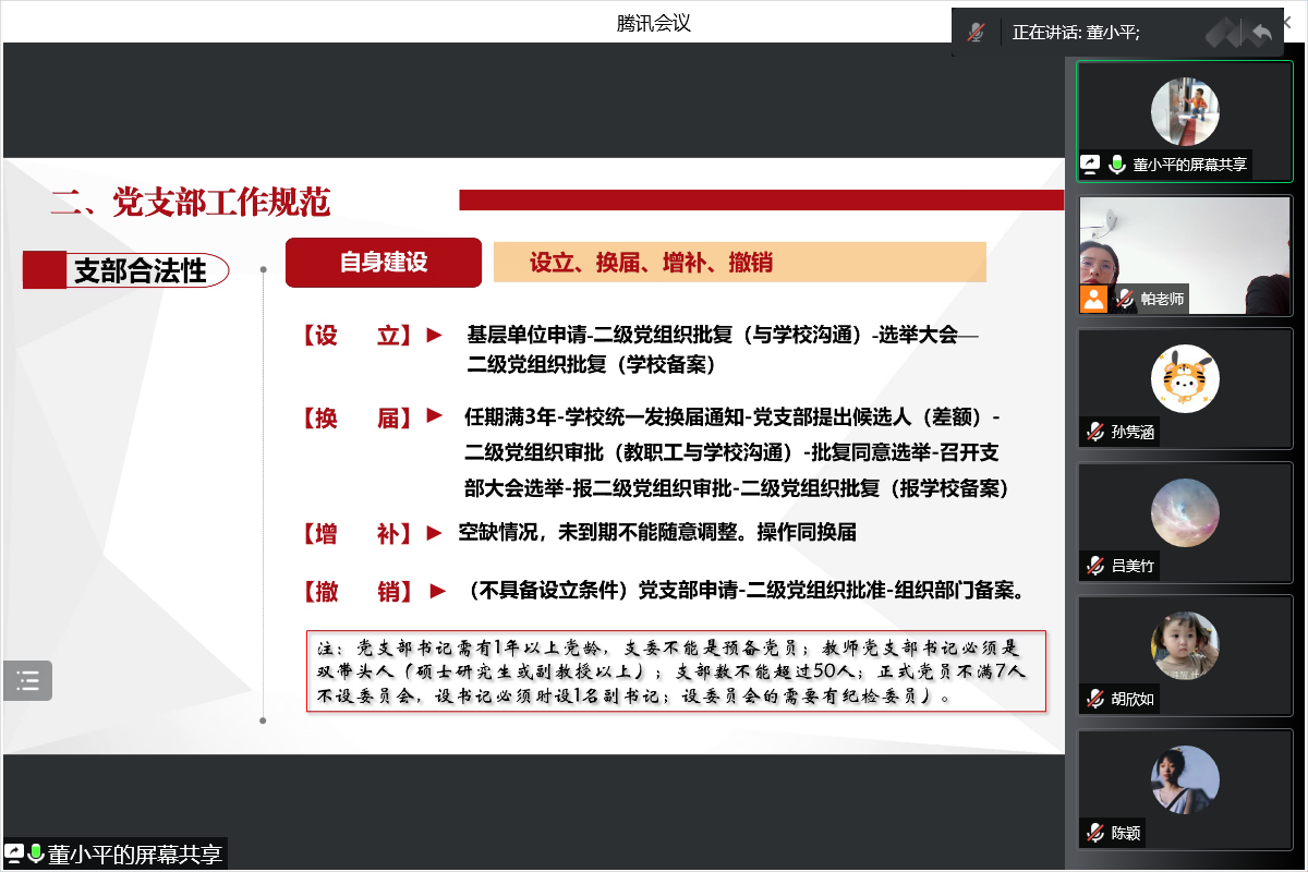 董小平进行“党支部工作规范和工作纪实”主题培训,结合相关政策文件、工作条例和实际案例,分别从“党支部工作依据”“党支部工作规范”“党支部工作纪实”等三个方面进行讲解。他具体解读《中国共产党支部工作条例》中规范党支部工作的八大基本任务,重点对组织生活、“三会一课”、主题党日活动、专题组织生活会、组织生活会和民主评议党员等进行概念辨析、流程要求上的具体解读。他结合巡视巡察反馈的问题,对《党支部工作手册》中记录内容、支部活动等出现的不完整、不规范、不完备等问题进行剖析,提出工作要求。最后,董老师提出要提高思想认识、熟悉工作流程、强化责任担当、加强监督指导,形成党建工作的联盟化、系列化、品牌化、融合化。