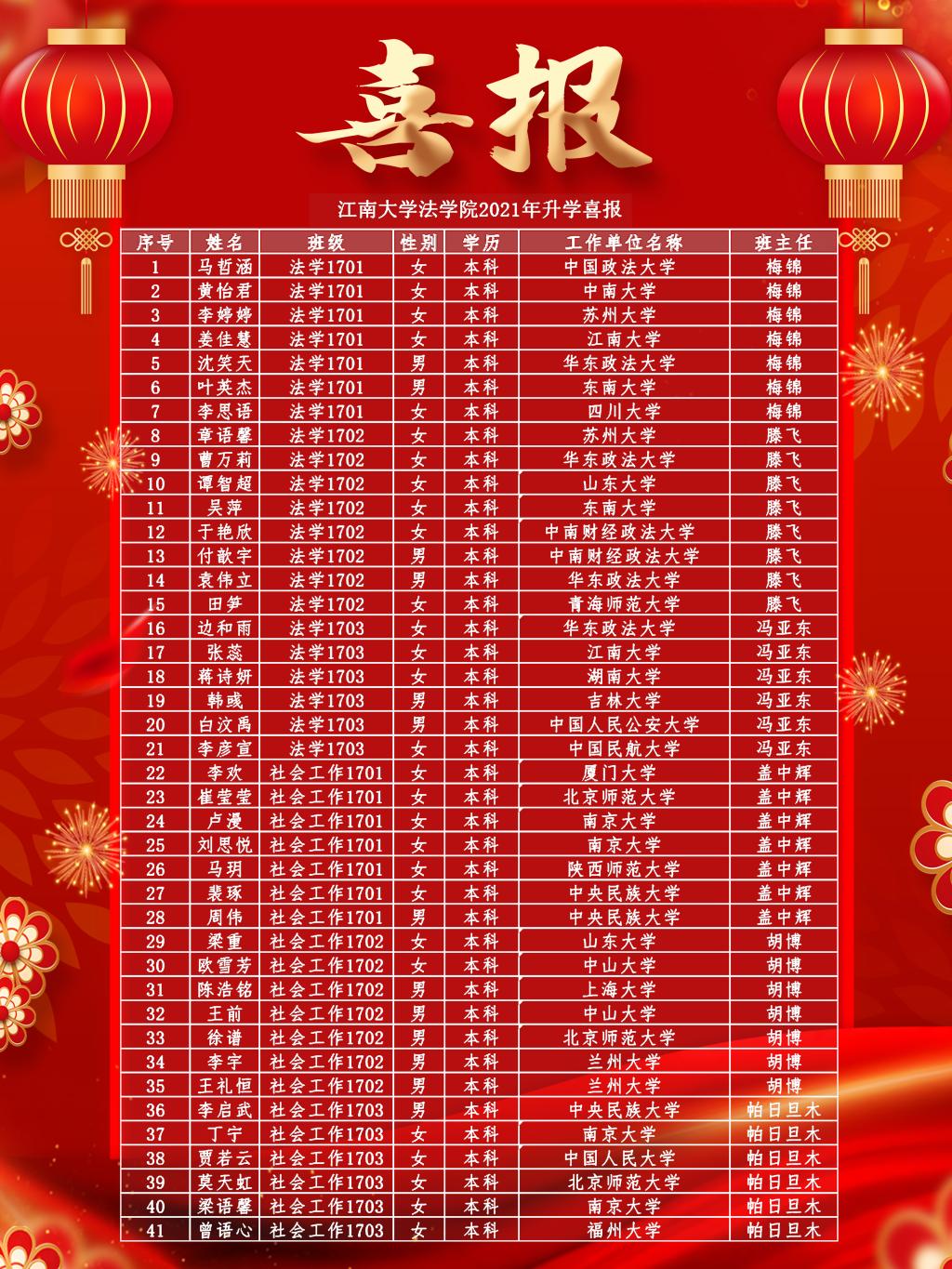 yl7703永利官网2021届本科毕业生考研取得可喜成绩,共41名毕业生升学至中国人民大学、中国政法大学、南京大学等国内知名高校。
