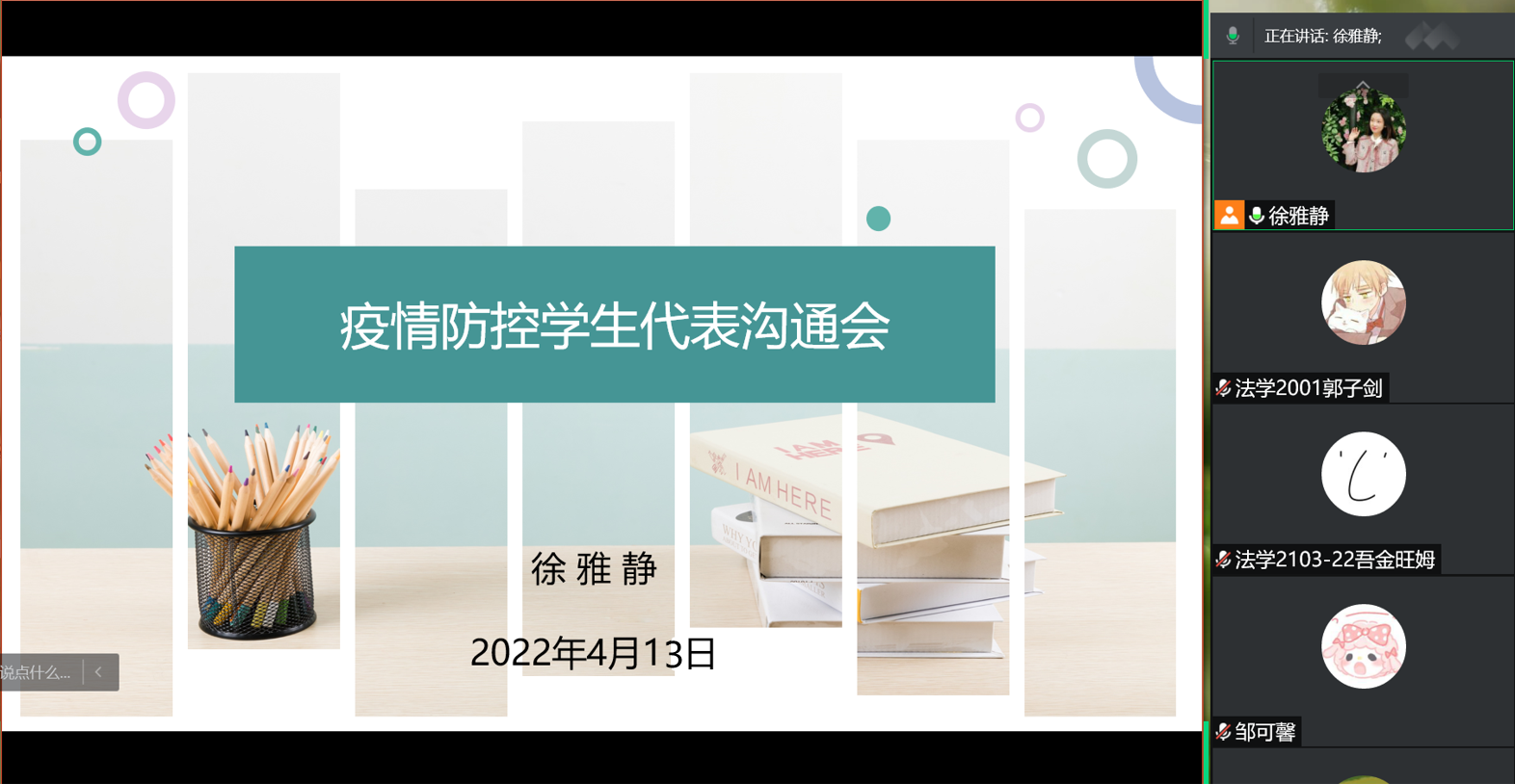 4月13日下午2:00,yl7703永利官网于线上腾讯会议召开疫情防控学生代表沟通会,会议由yl7703永利官网分团委书记徐雅静主持,本科、研究生共130余名学生代表参会。