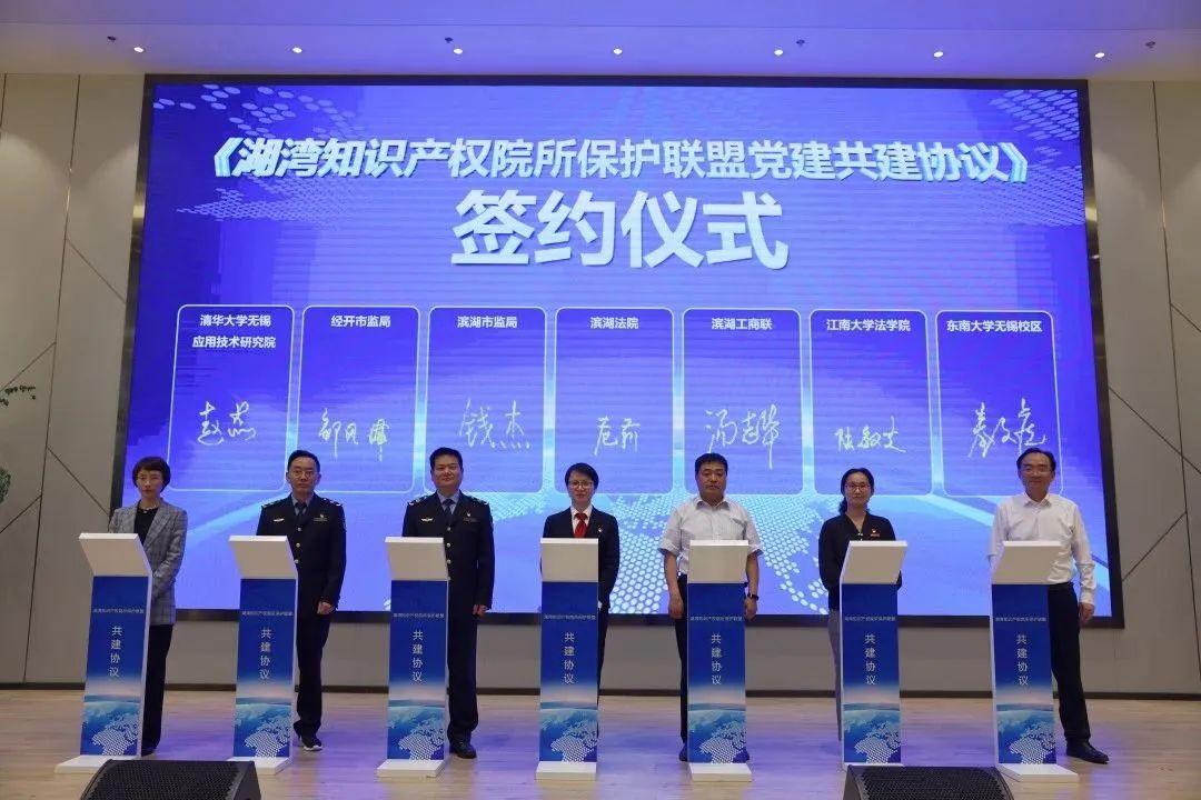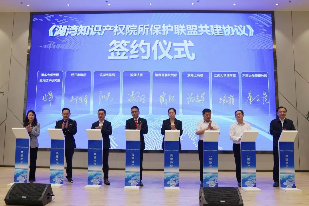 为深入贯彻习近平总书记关于加强知识产权保护的系列重要指示精神,进一步推动太湖湾科创带高质量发展,4月19日下午,太湖湾首个知识产权院所保护联盟组织——“湖湾知识产权院所保护联盟”正式成立。yl7703永利官网作为高校代表加盟,该联盟由无锡市滨湖法院牵头,涵盖辖区内相关部门、科研院所、法律服务机构等16家联盟,市中院、市知产局及滨湖区委、经开区管委会等相关领导到会见证指导,yl7703永利官网党委书记陆敏芝、院长王君柏、副院长叶敏出席签约仪式。