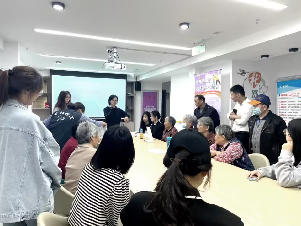接下来,师生来到丽新社区党群服务中心,社区书记介绍丽新社区基本情况以及“倷伲金乡邻”居民自治品牌建设情况。学生们近距离学习了丽新社区较为成熟、完善的居民自治品牌建设过程,切身体会到基层治理趋于丰富与多元化。介绍结束后,学生们踊跃发言,围绕社区养老、就业方面的问题提出对基层社区治理的认识和疑问,社区工作人员也进行耐心解答。在现场融洽和谐的交流氛围中,团队成员了解到更多关于社区治理和认知障碍防治项目相关知识,收获颇丰,也有效促进了专业知识与社会实践的发展。