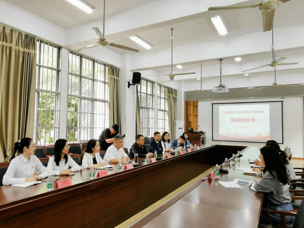 党建座谈会上,陆敏芝代表学院对邵建东、虞仕俊一行表示诚挚欢迎,并对yl7703永利官网发展沿革、专业特色、党建工作等进行介绍,她希望通过多方深入交流,合作共建,切实提升党建凝聚力,扩大党建“朋友圈”,实现校企合作双向赋能和共享共赢。邵建东、乔珍珍分别介绍了无锡市建设发展投资有限公司情况及“红五XIN”党建品牌——“砥砺初心、铸强核鑫、守正创新、薪火相传、欣欣向荣”,通过党建引领,强化党业融合,汇聚发展动能,不断塑造党建引领业务高质量发展的新优势。虞仕俊介绍开炫律师事务所业务范围、特色服务以及各项事业开展情况,他表示,作为yl7703永利官网董事单位,会持续增进与学院的合作,为法律人才培养助力增效。