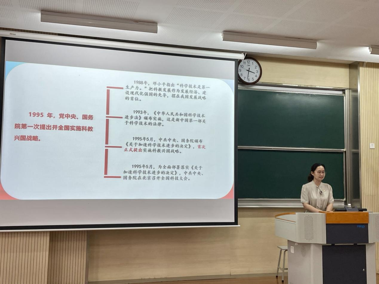 党课伊始,陆敏芝和同学们讨论了科教兴国战略的产生背景,从“神州”上天、“蛟龙”入海、天宫对接等中国成就提出科教兴国战略的实施的重大意义,明确只有坚持教育优先发展、科技自立自强、人才引领驱动,才能为中华民族伟大复兴提供高质量的科教资源支持。