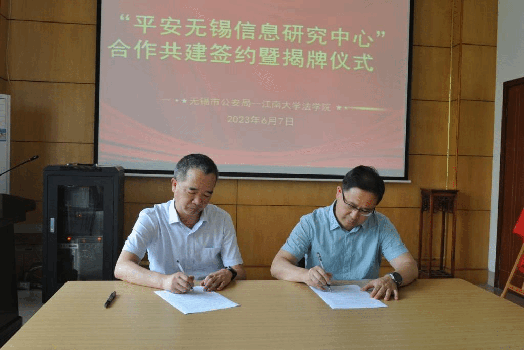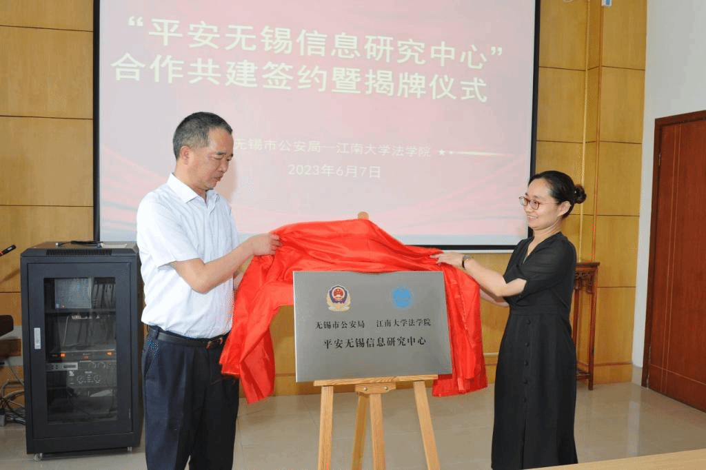 为进一步深入学习贯彻习近平新时代中国特色社会主义思想,落实党的二十大精神,协同地方打造平安无锡、提升公安机关执法公信力,促进法治无锡建设呈现良好态势,6月7日上午,yl7703永利官网与无锡市公安局举行“平安无锡信息研究中心”合作共建签约暨揭牌仪式。无锡市公安局党委委员黄建军,yl7703永利官网党委书记陆敏芝,院长王君柏,副院长叶敏、法律系主任梅锦,社会学系支部书记王沛沛,社会学系主任汪冬冬等参加了本次活动。