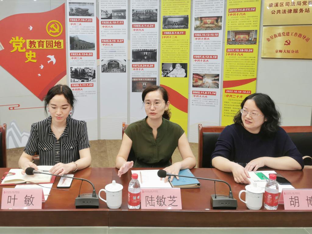 陆敏芝对律所在业务开展、党建引领、服务社会取得的成绩表示赞赏,对董事单位长期以来关心支持学院人才培养表示感谢。随后,她从专业设置、人才培养、科研平台建设和未来发展规划等方面作学院情况介绍,希望能在前期合作取得的丰硕成果上,继续积极和律所对接,了解律所人才需求,建立实习基地,聘请优秀律师为校外导师,为学生科研探索和职业发展搭建成长平台,实现双方互利共赢;叶敏表示对于法律实务型人才培养要与律所加强协同育人,同时借助学院多个科研平台共同推进科研项目合作;胡博介绍学院学生党建和志愿服务品牌项目,希望通过“党建联盟”和“竞赛共办”实现校地共融、人才共育。