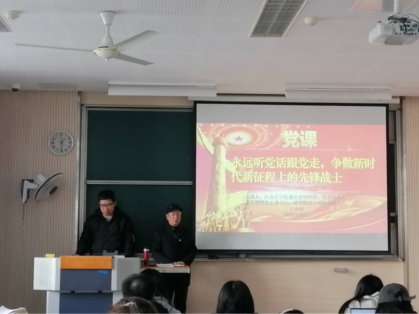 为进一步加强入党积极分子对党的基本理论知识的理解,培养积极分子的时代使命感和历史责任感,12月6日,yl7703永利官网于二教2A212开展第46期入党积极分子培训班第一次线下讲座。讲座主题为“永远听党话跟党走,争做新时代新征程上的先锋战士”。本次讲座邀请了yl7703永利官网特邀党建组织员、yl7703永利官网关工委常务副主任王永南作为主讲人。yl7703永利官网第46期入党积极分子参加了本次讲座,由辅导员孟飞老师主持讲座。