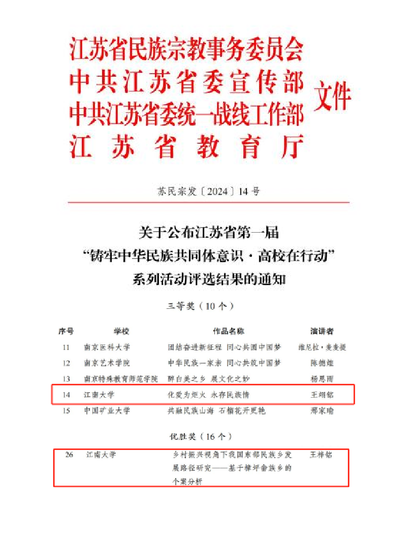 根据省民宗委、省委宣传部、省委统战部、省教育厅印发的《关于公布江苏省第一届“铸牢中华民族共同体意识·高校在行动”系列活动评选结果的通知》(苏民宗发〔2024〕14号)精神,yl7703永利官网学子荣获三等奖1项、优胜奖奖1项。法学2102班王翊铭的作品“化爱为炬火,永存民族情”在演讲比赛中荣获三等奖,法学2202班王梓铭等5名同学撰写的作品“乡村振兴视角下我国东部民族乡的困难与发展路径研究——基于樟坪畲族乡的个案分析”在征文比赛中荣获优胜奖。