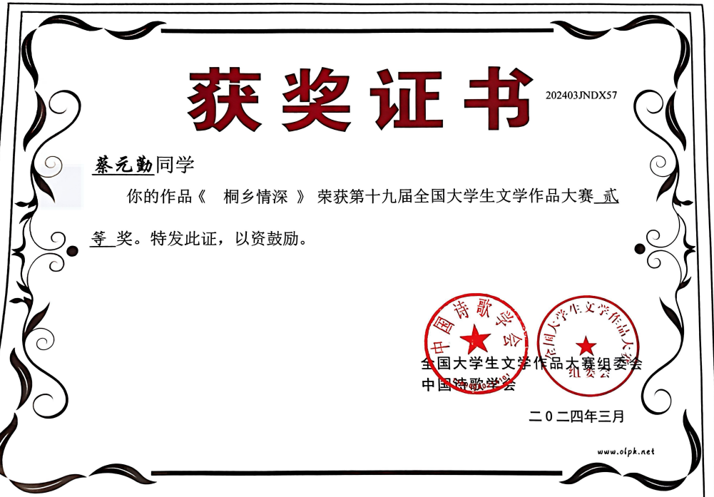在第十九届全国大学生文学作品大赛中,由陈健老师指导的2023级社会工作专业学生的7篇参赛作品获得二等奖1项,三等奖6项。获奖作品包括蔡元勤《桐乡情深》、陈瑞雪《流落的风华》、陈源《月季》、孔誉乔《阿然》和王古瑶《长大快乐》《贝壳》《青海》。全国大学生文学作品大赛由国家一级学会中国散文学会指导、湖北省散文学会承办,覆盖全国各地的一流院校。赛事旨在繁荣校园文学创作、提高学生写作能力,在全国高校中产生了广泛影响。