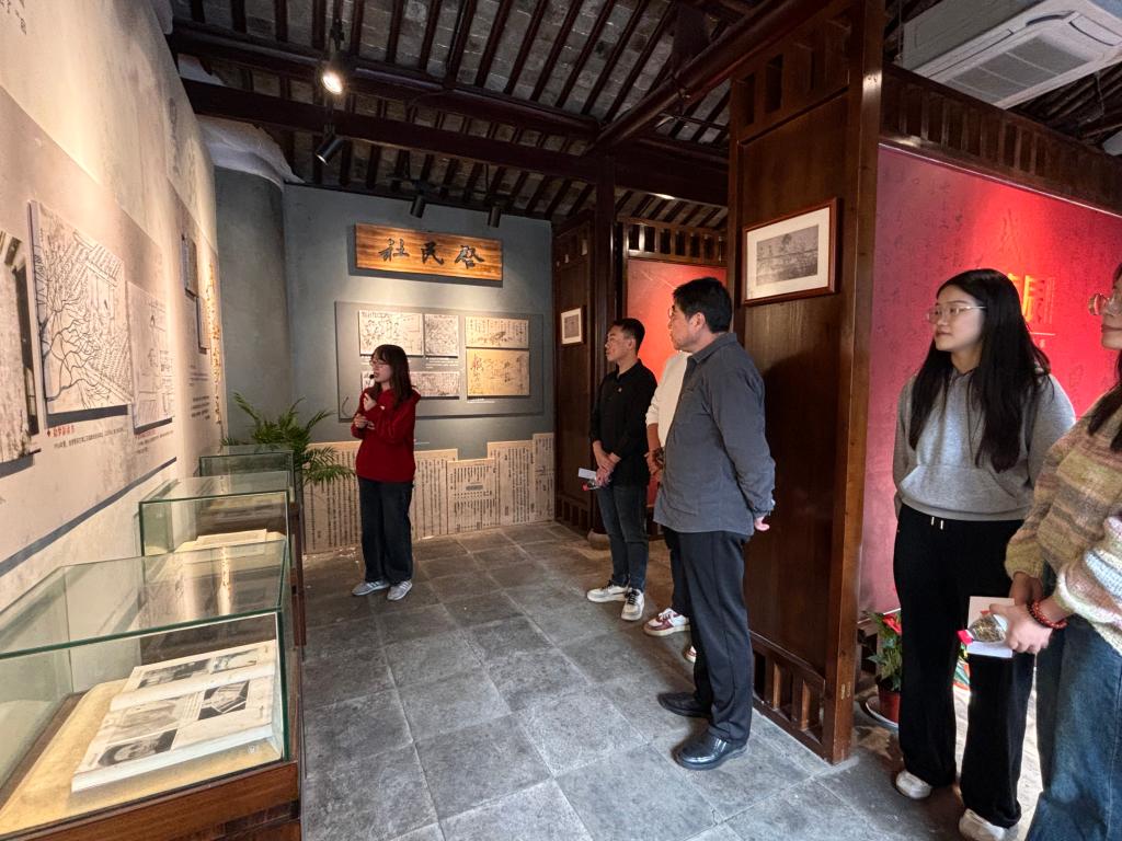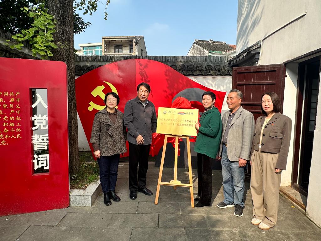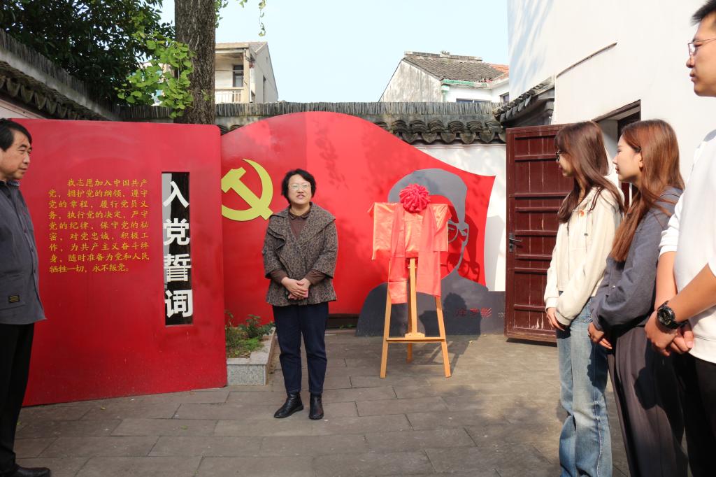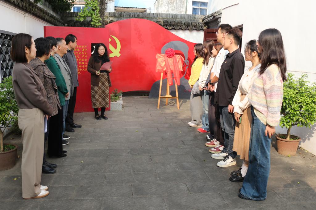 活动伊始,荣巷街道梅园社区副书记黄芳介绍梅园社区建设情况以及徐梦影烈士事迹。徐梦影为无锡农村发展的第一个共产党员,开办农村夜校、培训农民运动积极分子,并组建农民协会(又称农民俱乐部),始终将“启发人民智慧”放在首位,此事被毛泽东作为典型事例写进《江浙农民的痛苦及其反抗运动》一文中。在场同学们对徐梦影的家国情怀和革命事迹表示崇高的敬意。胡博发表致辞,希望发挥校地携手作用,充分利用文化资源和实践育人阵地,引导青年学生传承红色基因,赓续红色血脉。接下来,双方代表共同为“yl7703永利官网关工委与荣巷街道关工委关心下一代教育基地、砺·行大学生红色思政实践基地”揭牌。最后,师生一行参观了徐梦影烈士革命旧址和红色互动场馆。