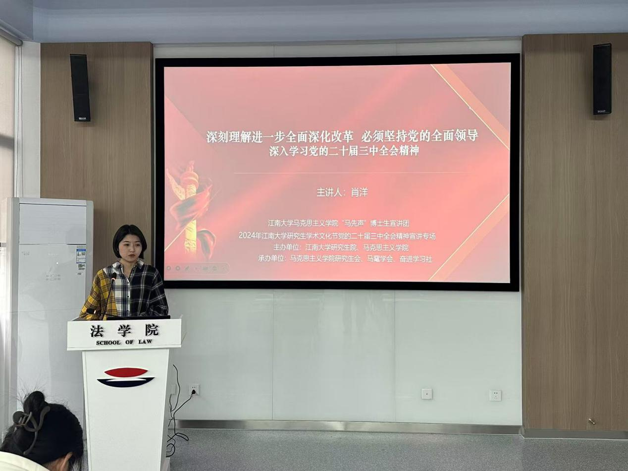 接下来由马克思主义学院“马先声”宣讲团成员、2024级博士研究生肖洋带来《以“制度建设为主线挈领进一步全面深化改革——深入学习党的二十届三中全会精神”》主题宣讲。她阐述了深化全面改革、推进中国特色现代化的重要意义和总体要求,帮助同学们更深入地理解党的二十届三中全会所规划的全面深化改革的时代蓝图,深刻领会这次全会所承载的承前启后、开创未来的里程碑意义。随后,肖洋阐述了制度建设对于全面深化改革的深刻内涵,她指出,制度优势是一个国家的最大优势,制度竞争是国家间最根本的竞争,制度稳则国家稳,制度强则国家强。通过深入浅出的讲解,同学们认识到制度的完善和创新是全面深化改革的关键,也是实现中华民族伟大复兴中国梦的重要保障。最后,她通过列举生动案例“雄安新区建设”“编纂无锡史促进无锡历史文化传承”阐释了二十届三中全会精神内涵,使理论变得通俗易懂,让同学们听得懂、记得住、用得上,引发同学们深切共鸣。