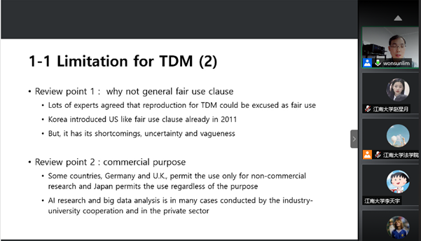 林教授在会议上首先向我们介绍了有关韩国著作权法修正案的现状和历史,韩国于2016年对该修正案进行基础的研究,并于2020年组成研究小组,同年十一月和十二月举行了两次公开听证会。接着,林教授讲述了相关部门因科技发展而对著作权产生影响的反应,其中包括对TDM的限制,对数字同步传输的引入,对非法链接网址的监管以及对形象权的介绍。然后,林教授就如何恢复著作者与使用者之间的平衡问题,提出了额外赔偿请求权并且在雇佣他人完成的作品中标示真正的创作者。在用户安全方面,林教授介绍了ECL(extended collective license system)系统。另外,林教授还介绍了调解优先原则与依职权调解制度。讲座结束后是互动讨论环节,yl7703永利官网的同学们就自己对著作权法方面还存在的疑惑向林教授请教,林教授也非常耐心地给同学们一一进行了解答。