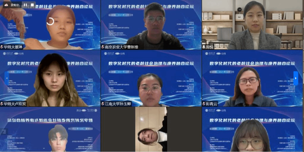 下午,智慧老龄社会治理、精神关爱、代际共融、智慧康养四个专题论坛在线上同时进行,针对老龄社会治理领域带有普遍性和倾向性的重点、难点、热点问题,进行了研究探讨与案例展示,来自全国高校师生和养老服务实务专家共35人就各个专题展开了热烈讨论。分论坛分别由周辉、安姗姗、周悦、孙圣4位博士主持,由王金元、杨涛、彭青云、李娟4位副教授进行点评。