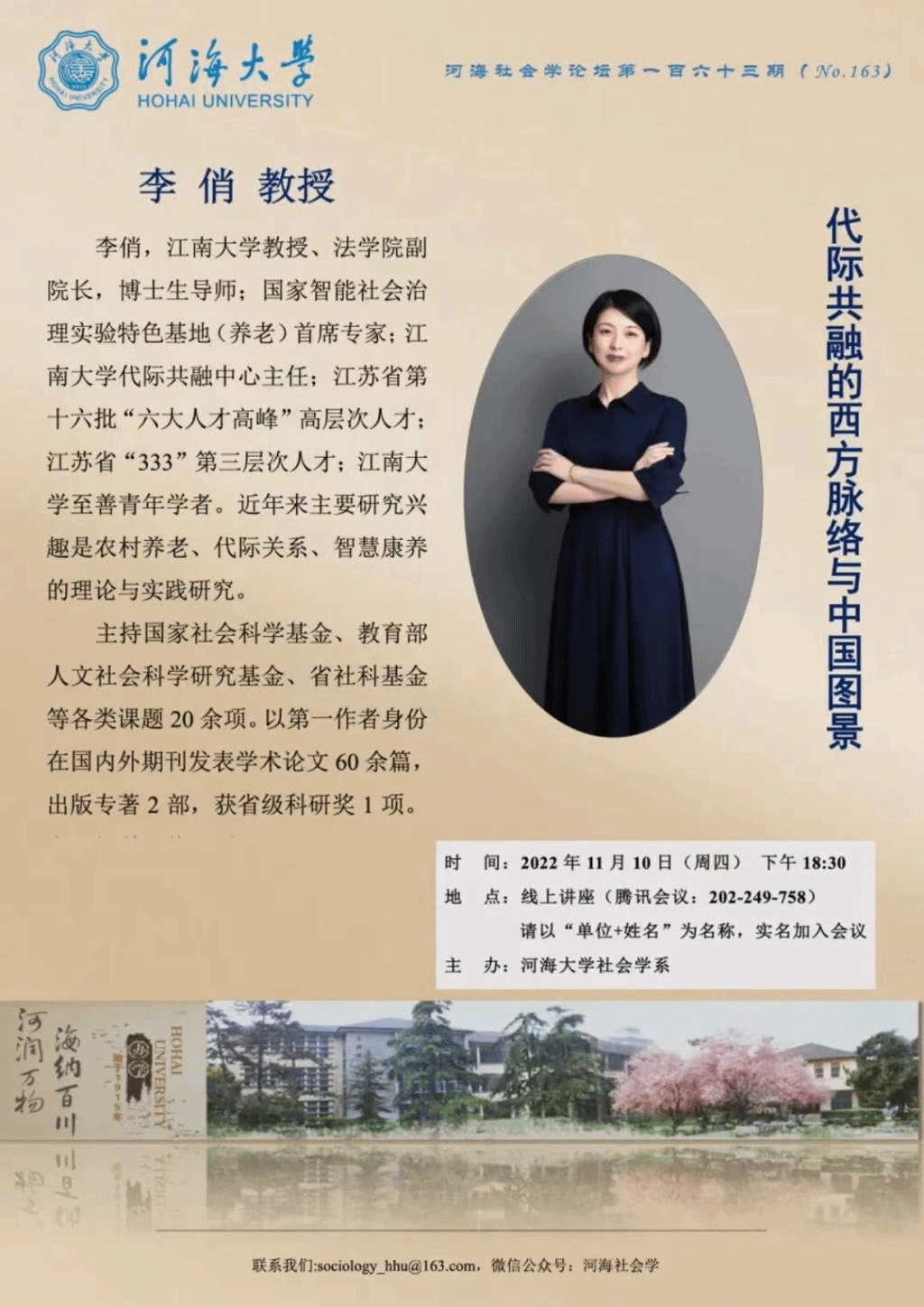 李俏教授是国家智能社会治理实验特色基地(养老)的首席专家、yl7703永利官网代际共融中心主任,中国老年学和老年医学学会青年委员会理事、中国老年学和老年医学学会农村养老分会常委,近年来围绕农村养老、代际关系、智慧康养等问题展开了深入研究。此次受邀河海大学社会学系讲学,进一步促进了我院社会学学科的校际交流与合作。yl7703永利官网秉持“请进来、走出去”的理念,积极支持院内教师参加学术交流,以彰显我院的研究特色。近两年创办了“德法力行讲坛”和“至善社会学论坛”,定期邀请国内外知名专家学者来校讲学,有效促进了学术交流与学科的融通发展。