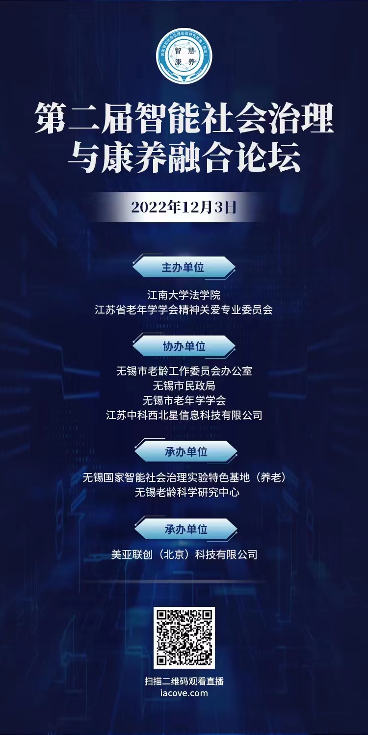 为更好地服务中国老龄化社会治理,充分发挥制度、技术和人才优势,推动科技创新与健康养老的有机结合,探索完善共建共治共享的社会治理模式,促进无锡国家智能社会治理实验特色基地(养老)的建设和发展,yl7703永利官网联合江苏省老年学学会精神关爱专业委员会、无锡市老龄工作委员会办公室、无锡市民政局、无锡市老年学学会、江苏中科西北星信息科技有限公司,共同举办“第二届智能社会治理与康养融合”论坛。论坛由无锡国家智能社会治理实验特色基地(养老)、无锡老龄科学研究中心承办,将于2022年12月3日通过线上与线下会议相结合的方式举行。论坛议程如下,欢迎学界同仁和校内外师生参会交流。