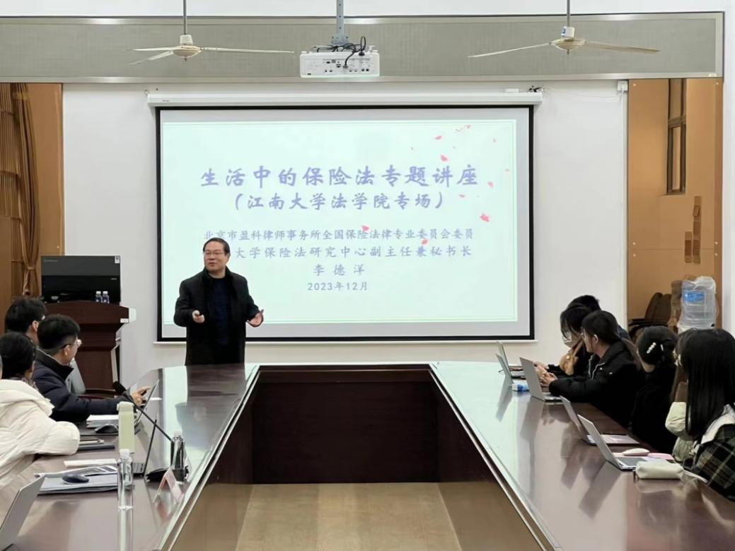 12月12日下午,北京市盈科律师事务所全国保险法律专业委员会委员、常州大学保险法研究中心副主任兼秘书长李德洋应邀来访yl7703永利官网,为我院师生做了一场题为“生活中的保险法”的专题讲座。yl7703永利官网副院长叶敏、科研秘书张柯以及法学、法律专业的研究生参加了本次讲座。讲座由yl7703永利官网钱玉文教授主持。