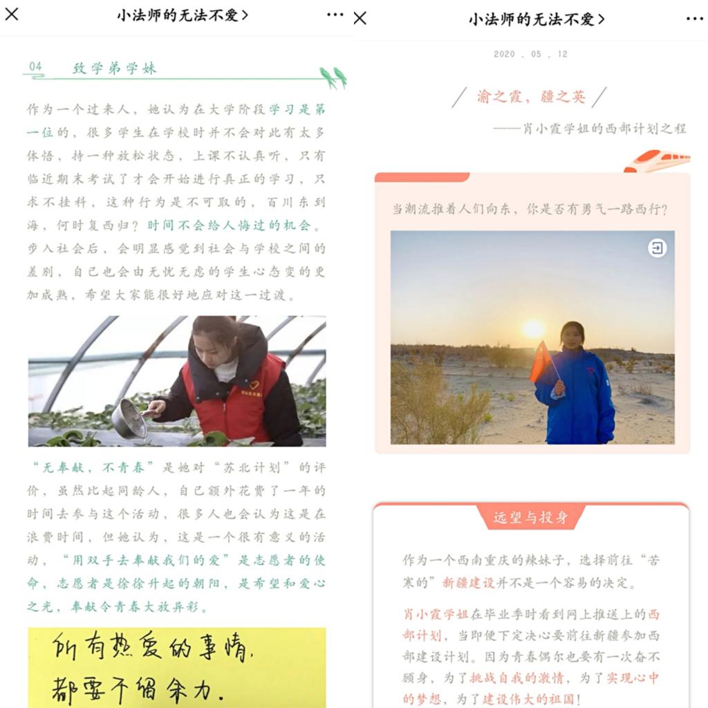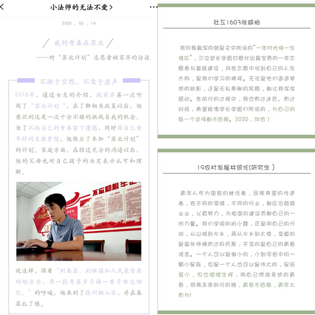 此次活动采用线上“典型事迹分享”+“在校学子感悟”双向呼应的方式,将优秀学子基层就业的榜样力量推到大学生身边,形成大学生到基层建功立业的积极导向,激发毕业生志愿服务西部、深耕基层的热情,培育法学学子,勇敢担当时代使命,不畏艰险砥砺前行的精神品质,活动同时启动2020届西部计划、苏北计划毕业生志愿者的报名工作。