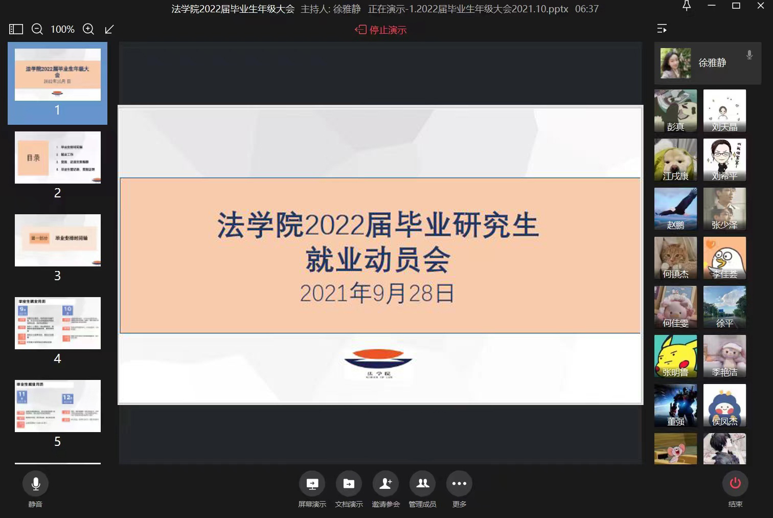 为提前做好2022届毕业研究生就业相关工作,保证毕业年级相关事项有序推进,帮助应届毕业生提前了解就业形势、明确就业方向,同时考虑到学校疫情防控要求,2021年9月29日,yl7703永利官网于线上召开2022届毕业研究生就业动员会,本次大会由yl7703永利官网研究生辅导员徐雅静老师主持,2022届毕业研究生一百余名学生参加线上会议。